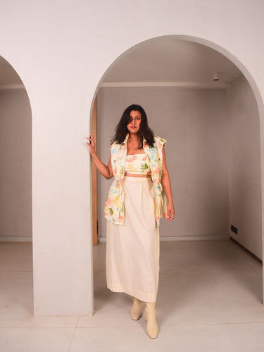 This straight sleek skirt in beige cotton linen fabric is definitely an essential in your wardrobe. Complete with pleats at the waist and slit at the back. Easy to style, chic and classic minimal looks can be obtained by styling this elegant piece. Pair with a fun printed Poppy Sleeveless Jacket or matching Amara Linen Vest for a head-turner.