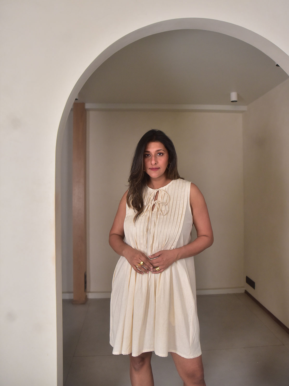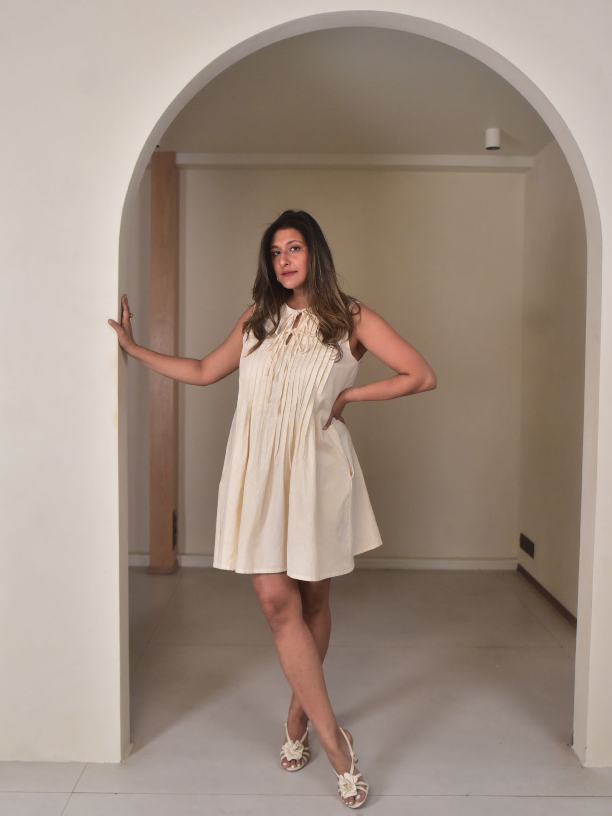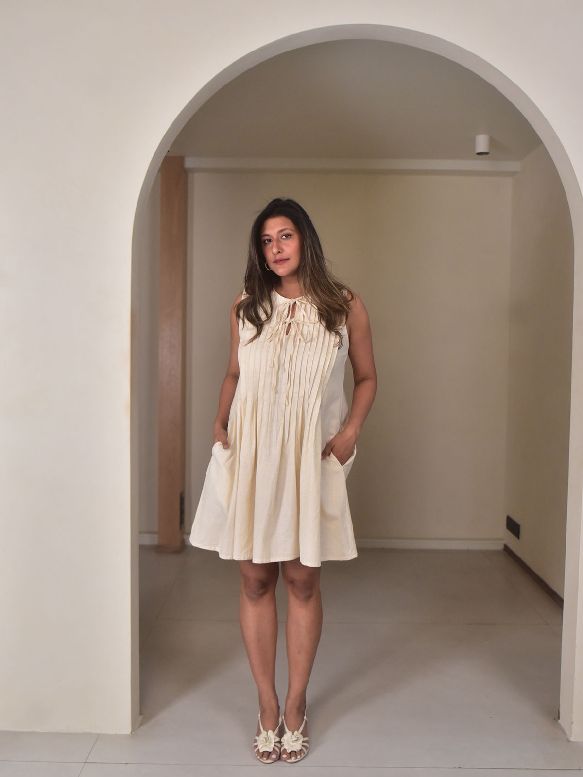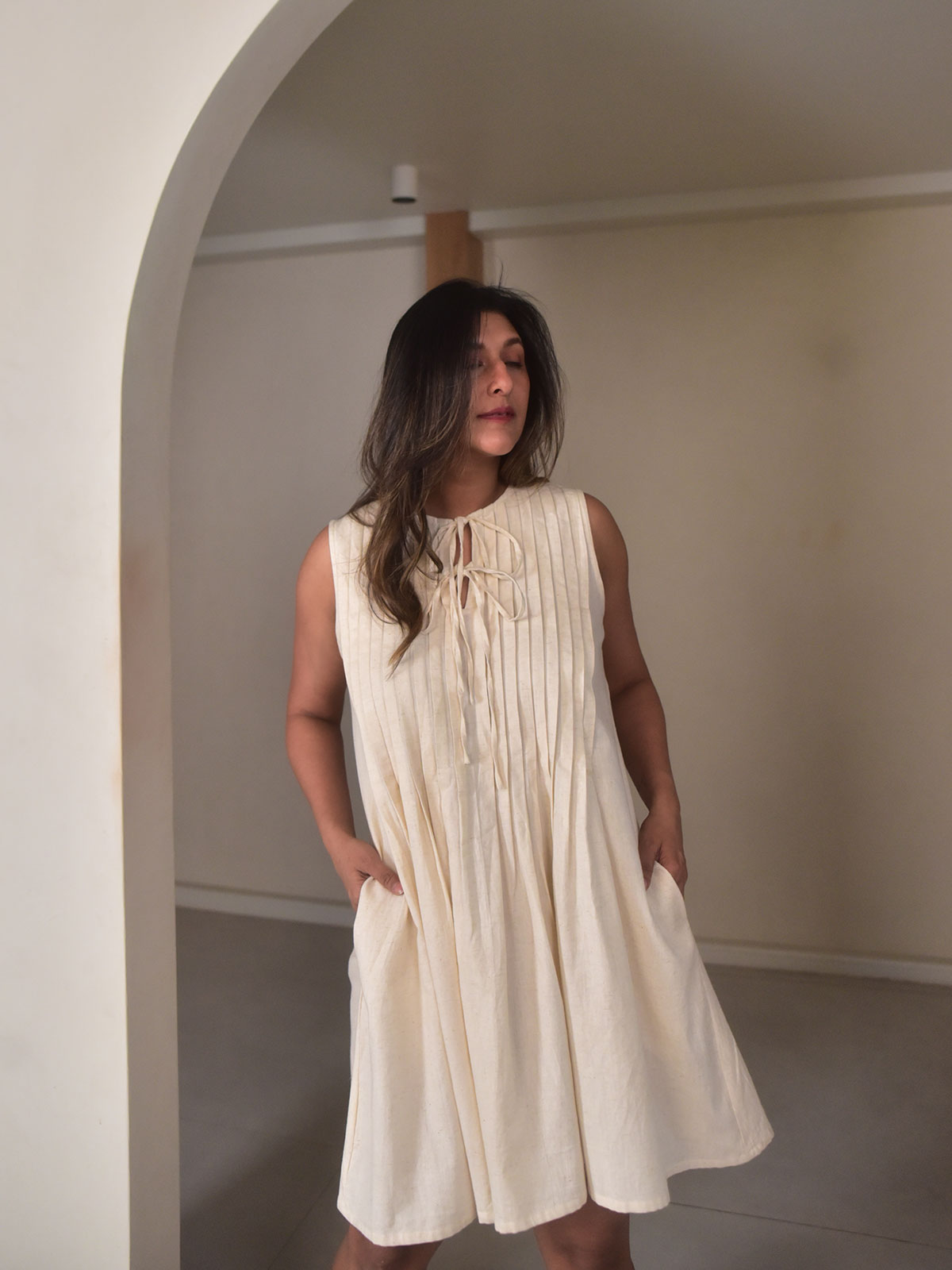 This short dress is crafted in our exclusive beige cotton linen and features delicate pin tuck detailing that adds texture and subtle structure to the design. The slit neckline with tie-up accents, soft flare at the hem, and practical side pockets create a balance between feminine detail and everyday comfort. Light and breathable, it’s designed for effortless wear. Style with sandals and minimal jewellery for brunches, vacations, or relaxed daytime celebrations.