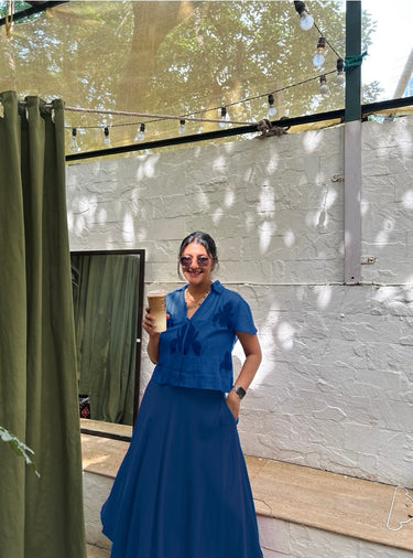 Designed in deep blue rayon, this umbrella-cut skirt drapes beautifully with a graceful, flowing silhouette. The elasticated waistband and handy side pockets add ease and comfort, making it perfect for vacations, casual lunches, or relaxed weekend outings. Style it with the Amara cotton net appliqué shirt in blue, and complete the look with flats or woven espadrilles for an understated, polished finish.