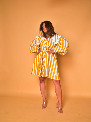 This short dress is made for dreamy summers. Cut in our exclusive mustard yellow and white striped cotton, it has a contrast pattern down the centre. The short flared silhouette is complemented by the shoulder flaps edged with white frills. Full puffed sleeves end in button-up cuffs. A look sure to turn heads this summer, complete the printed ensemble with our Elle Tote.