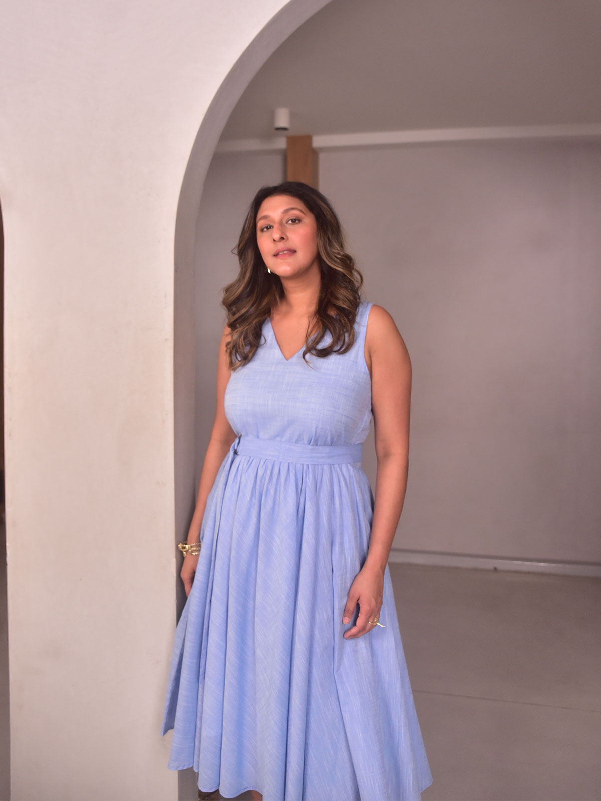 Cut in our soft light blue cotton chambray, this sleeveless dress features a curved V-neckline, gentle pleats below the yoke, and handy side pockets. It comes with a belt that cinches the waist to highlight curves. Designed for long days of exploring, it blends simplicity and ease. Pair it with a jacket or white sneakers for a timeless travel outfit.