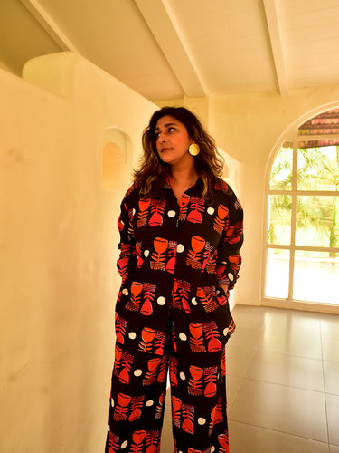 Cut in our exclusive hand-block print a rich black cotton with bright pink and orange floral motifs. These pants are laidback and perfect for easy styling. With an elasticated waist, drawstring tie-up and pockets on both sides, pair it with our Farida Shirt for a casual-chic vacay look.