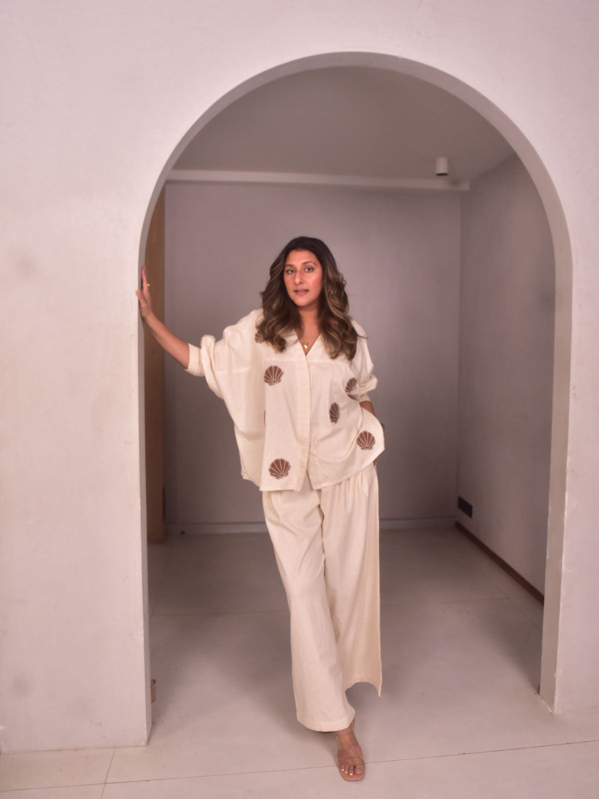 An oversized cotton linen shirt with smocked cuffs and delicate embroidered appliqués, the shirt combines ease with refinement. Perfect for artful travel days or creative meetups, it’s effortlessly chic. Style it with tailored shorts or our flared pants in the same fabric and sneakers for a relaxed yet polished look.