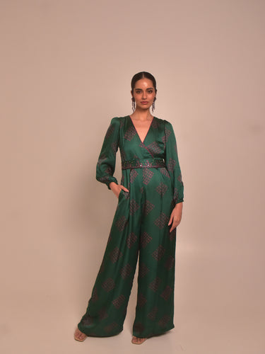 This jumpsuit in rich green kolam printed modal satin features balloon sleeves, inward pleats for flare, a V neckline, and side pockets for function. The look is elevated with an embroidered belt that cinches the waist perfectly. Ideal for cocktail events or evening parties, style with heeled sandals and bold makeup.