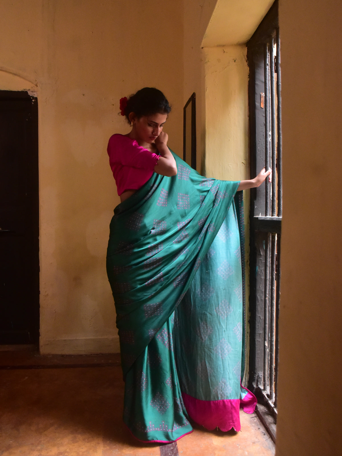 Fabric: Green Kolam Printed Modal Satin, Fuchsia Pink Dyed Modal Satin