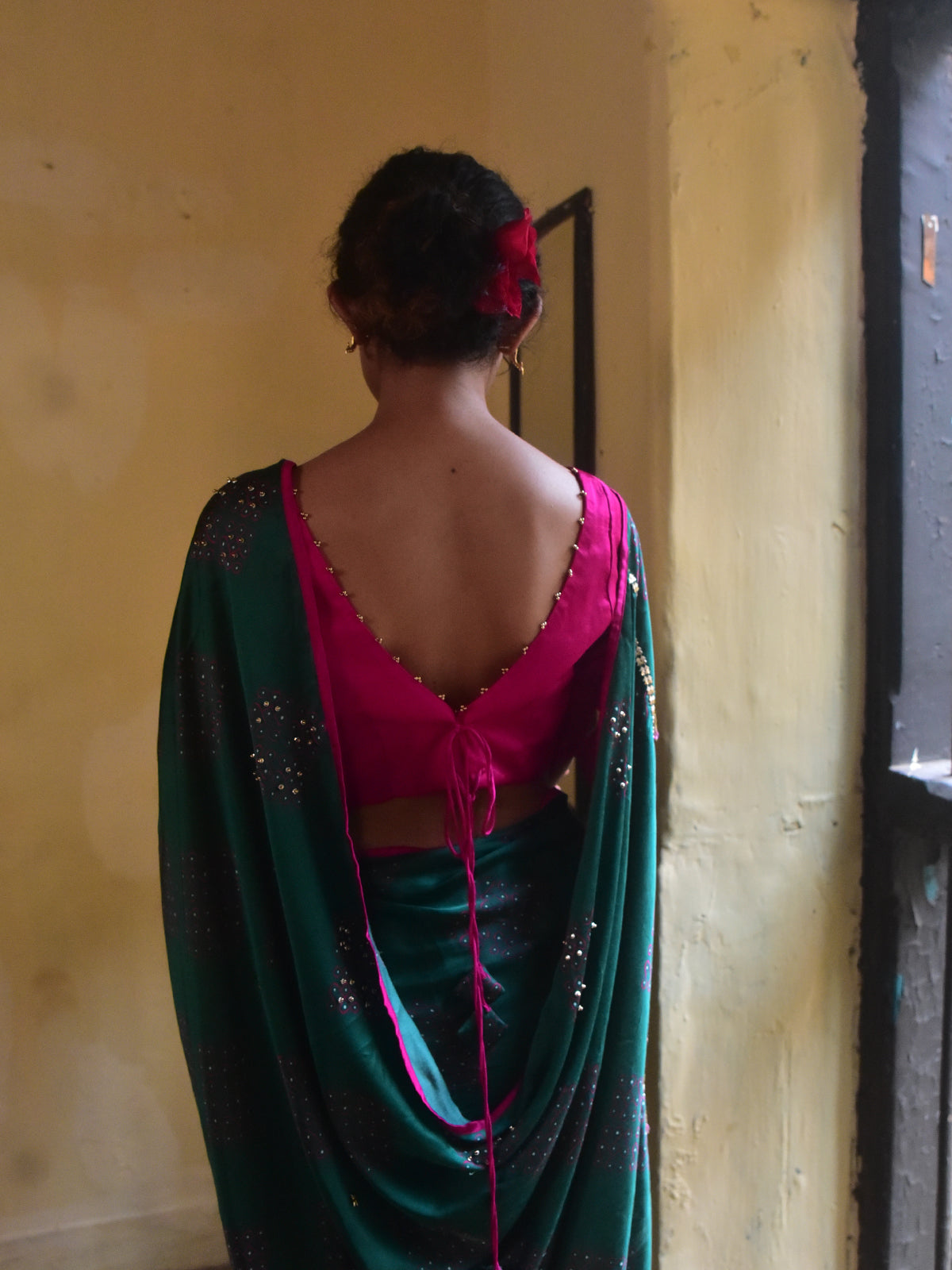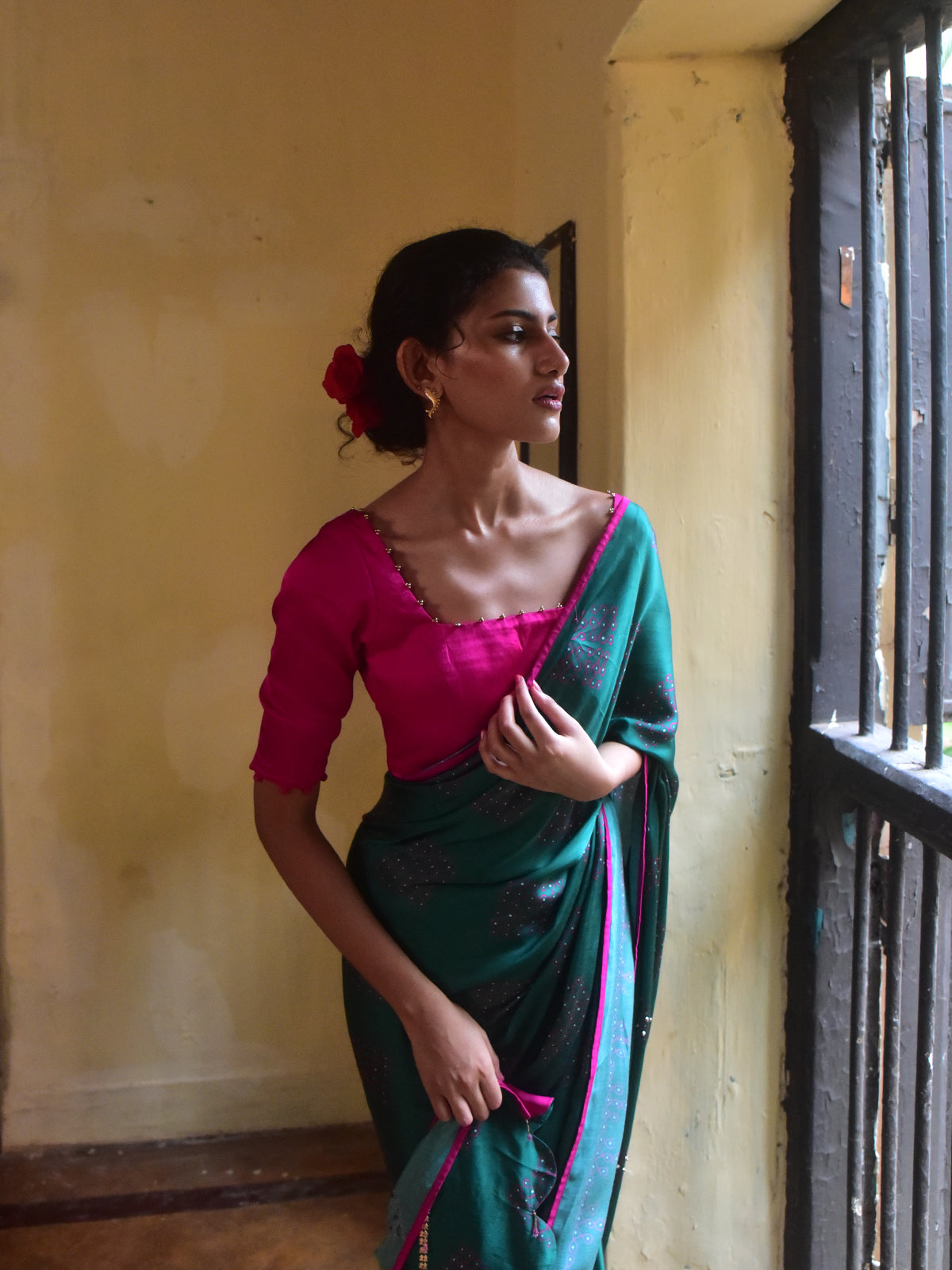 A vibrant celebration of color and craft, this six yard green kolam printed modal satin saree is embroidered with finesse and finished with delicate tassel details. It pairs beautifully with a fuchsia pink modal satin blouse featuring a square neckline, hand embroidery, and tie-up details. Perfect for weddings, receptions, or evening celebrations, style with bold lips and statement jewelry.