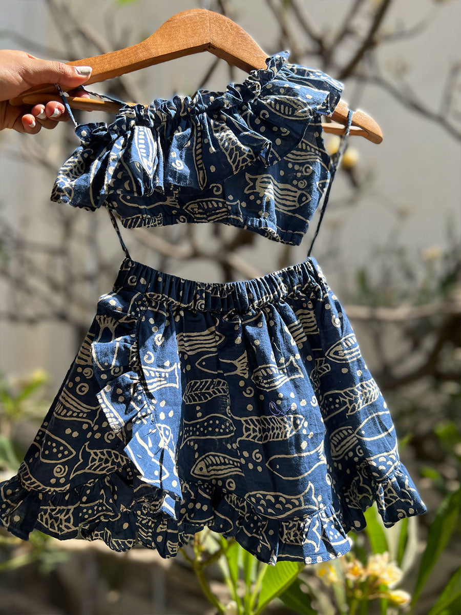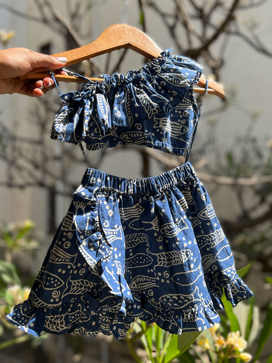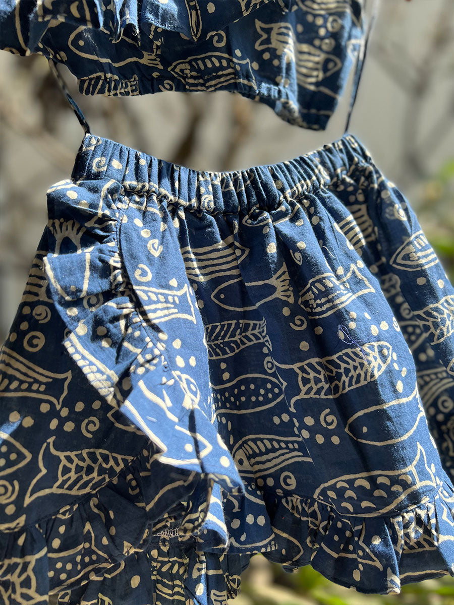 This ink blue skirt-top co-ord set is made for your summer holidays! Cut in hand-block printed cotton, the one-shoulder top has a ruffled sleeve and elastic at the waist. The skirt is cut in tulip-style with a ruffle at the hemline for a swish! The fabric is hand-block printed in Jaipur, and stitched by our skilled karigars in Thane.