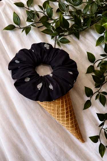 Made from black playing cards printed cotton, this scrunchie blends comfort with a striking print. Pair it with sleek ponytails or low buns for a polished finish. Ideal for everyday wear, casual evenings, or coordinated co-ord styling.