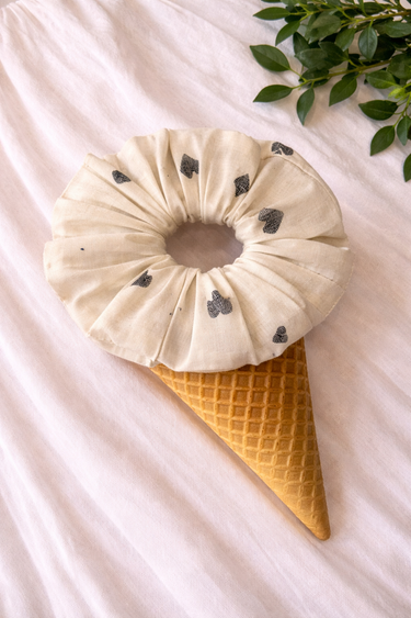 This scrunchie is crafted in white playing cards printed cotton, designed to add a fun pop of print to everyday hairstyles. Wear it with ponytails or messy buns for an effortless look. Ideal for casual days, travel, or playful summer styling.