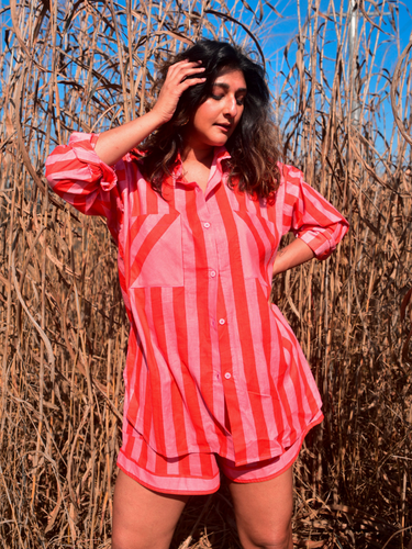 Cut in our exclusive orange and peach striped cotton, this oversized statement shirt has self-printed pockets with peach highlights. Pair it with our May Shorts for a lounge look, and pick the May Bralette for the perfect summer beach fit.