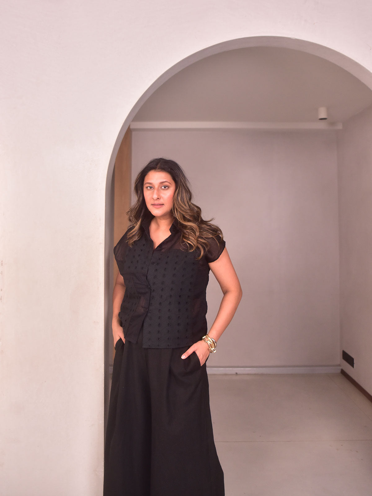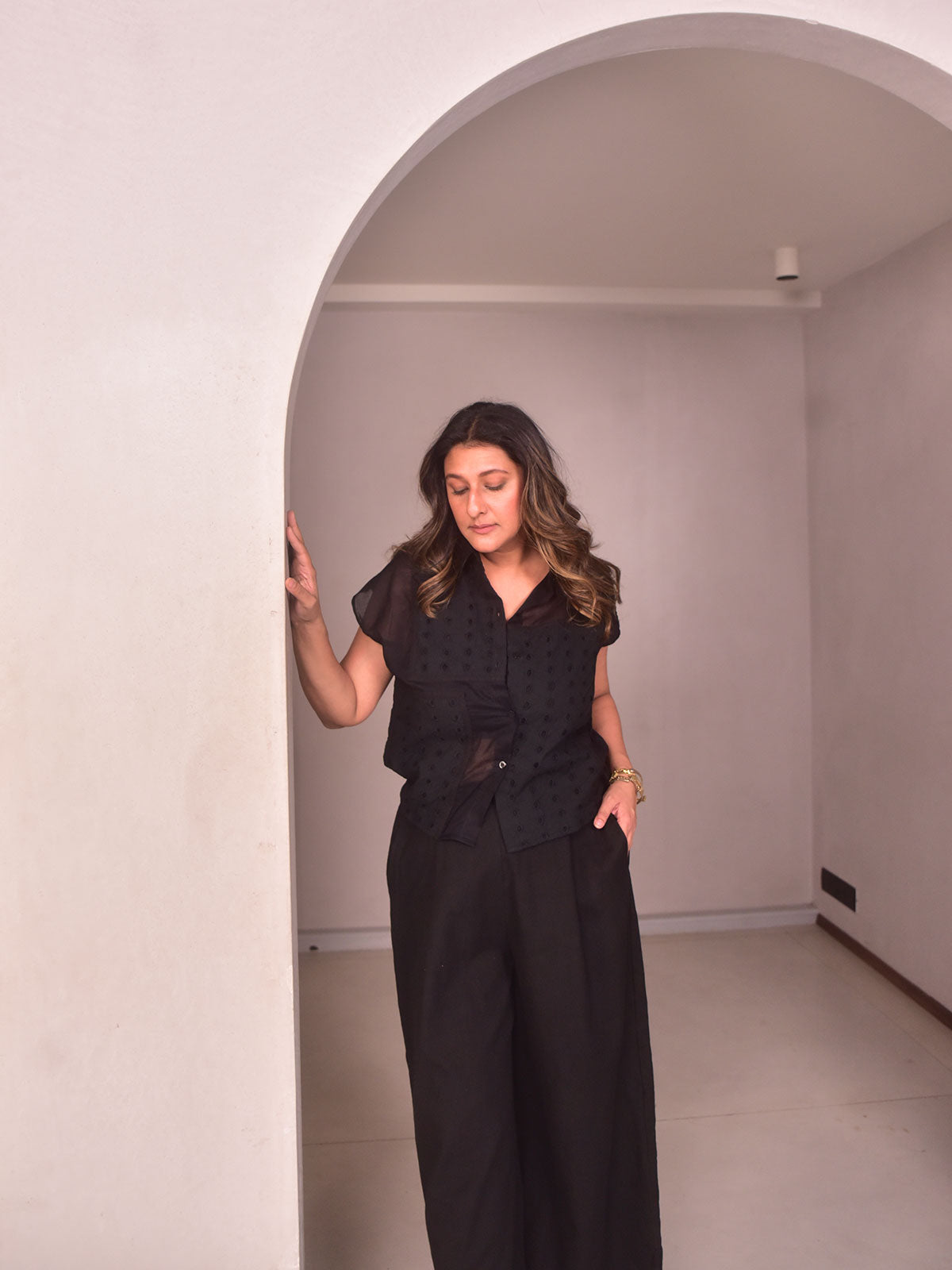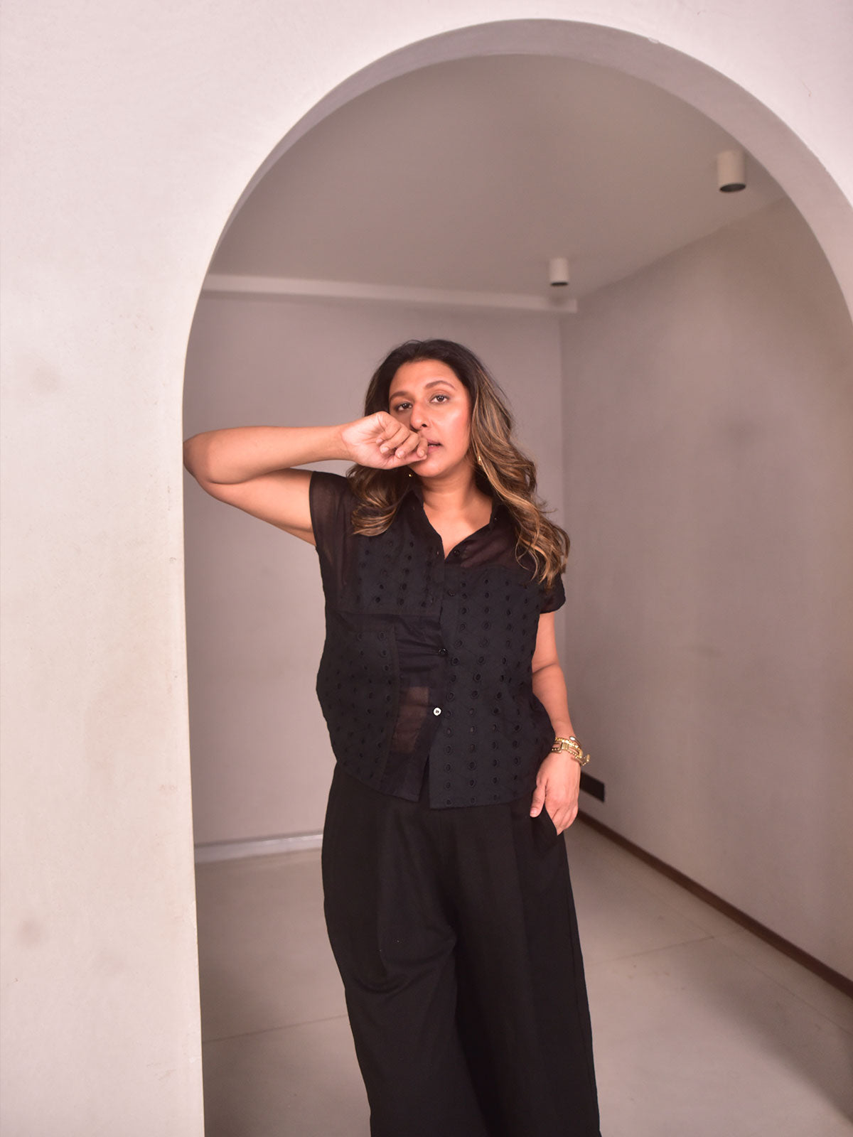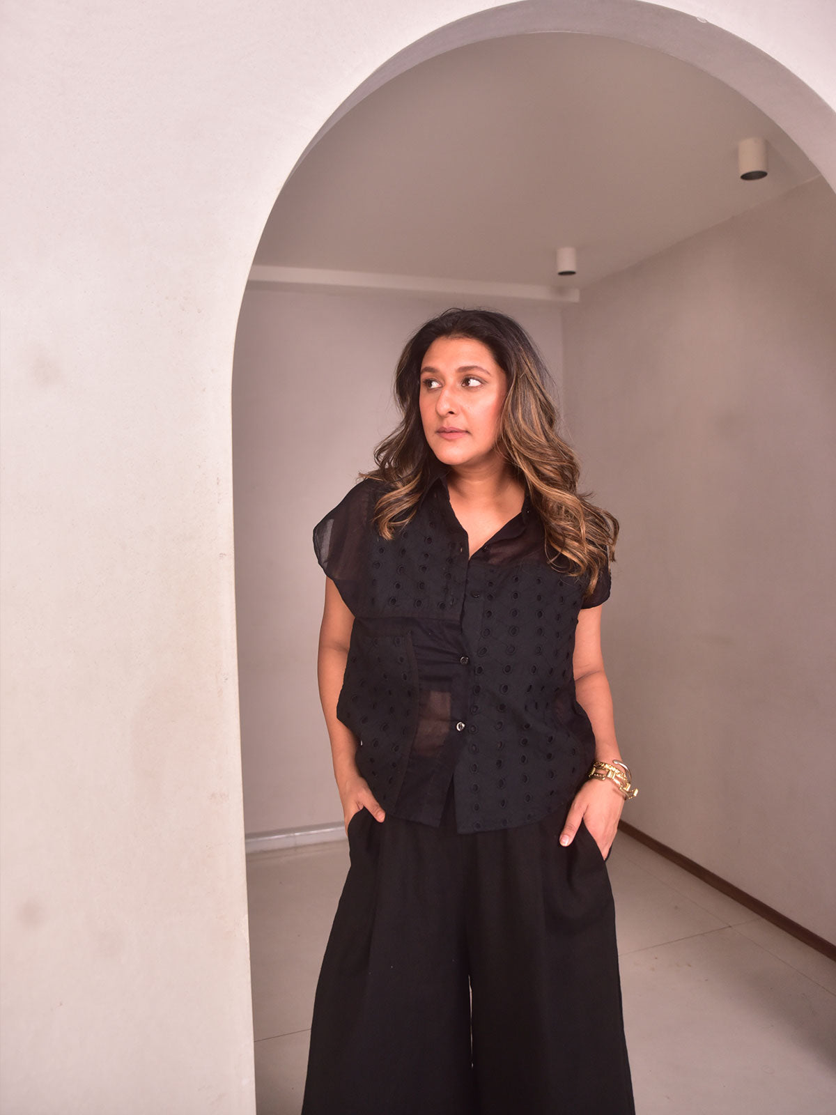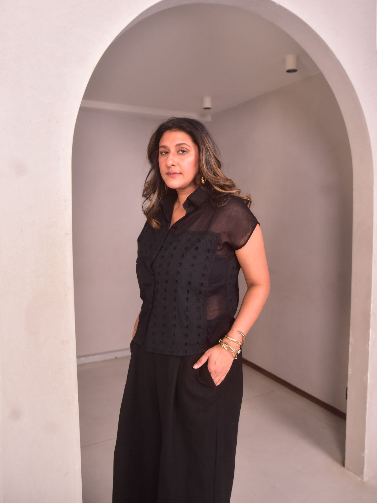 This fitted shirt in black mul cotton with hakoba patches features classic collars and drop shoulders for a modern yet timeless feel. Ideal for evening strolls or chic casual days, it pairs best with black cotton linen flared pants. Complete the look with flats and minimal accessories for a sleek monochrome statement.