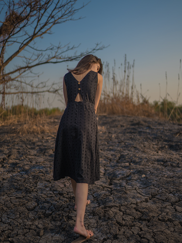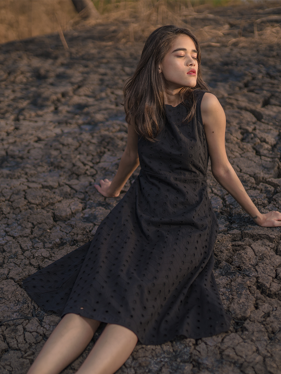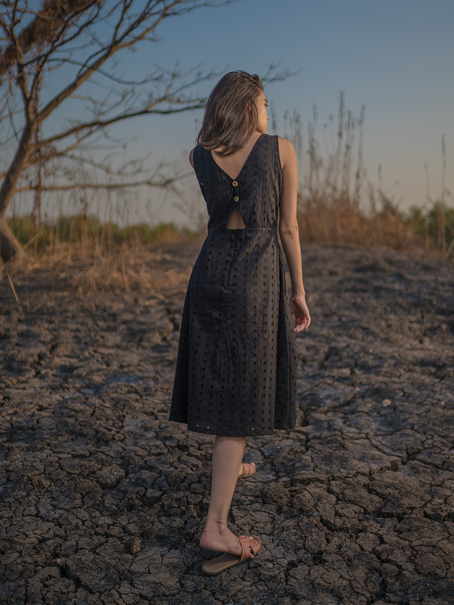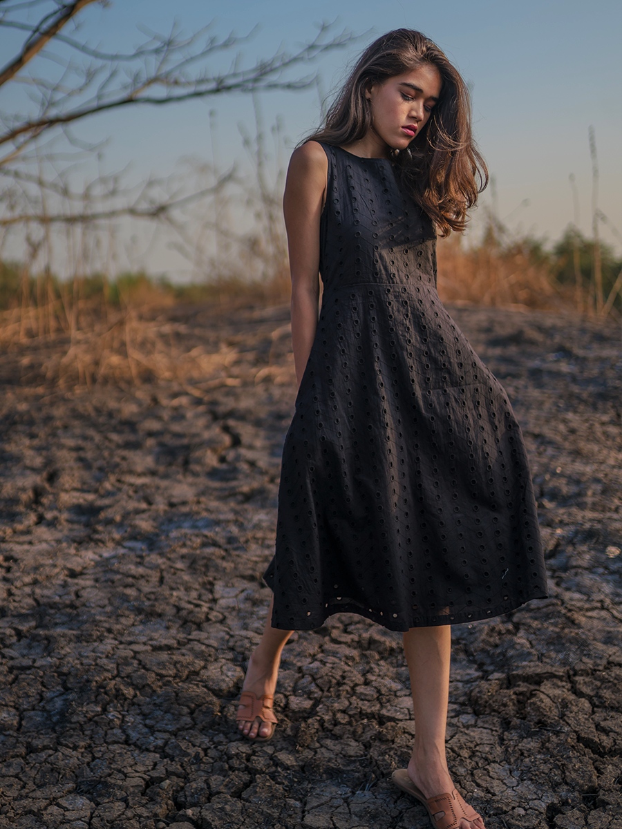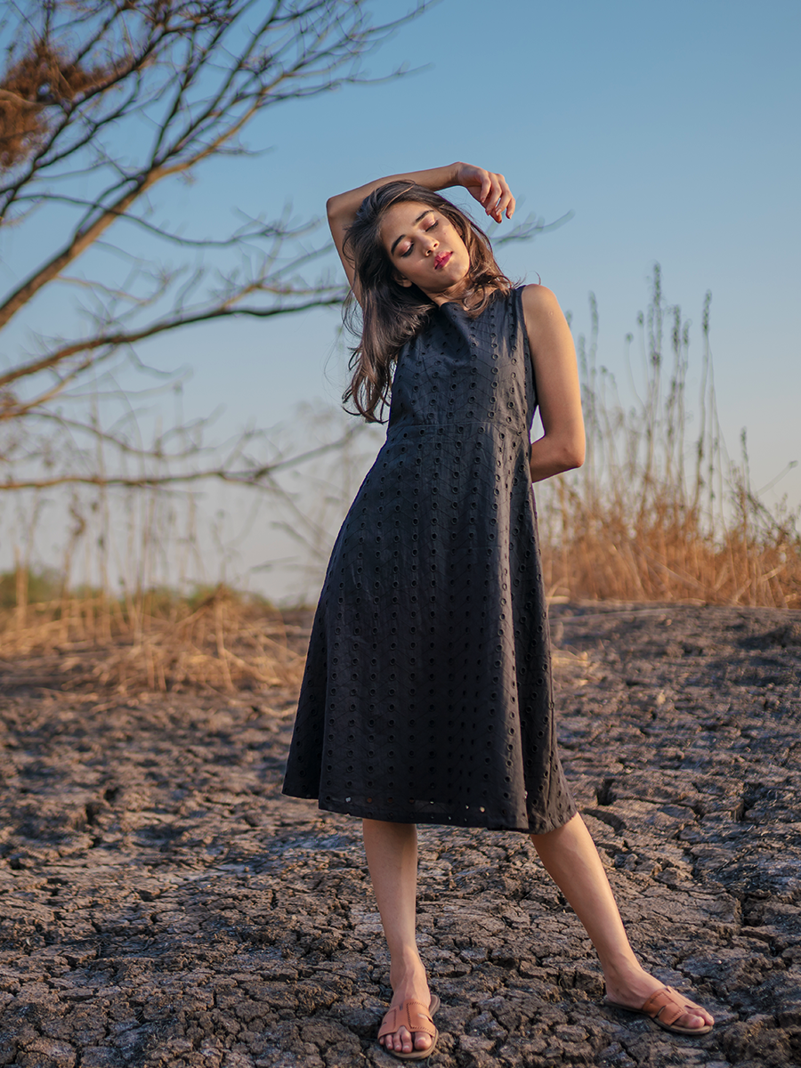 Thie dainty black dress is cut in embroidered cut-work cotton. It has a round front neckline and a comfy-fit bodice, with a peekaboo triangle cut-out at the back. The skirt is A-line for a comfortable look. Pair with black heels for a lovely date night!