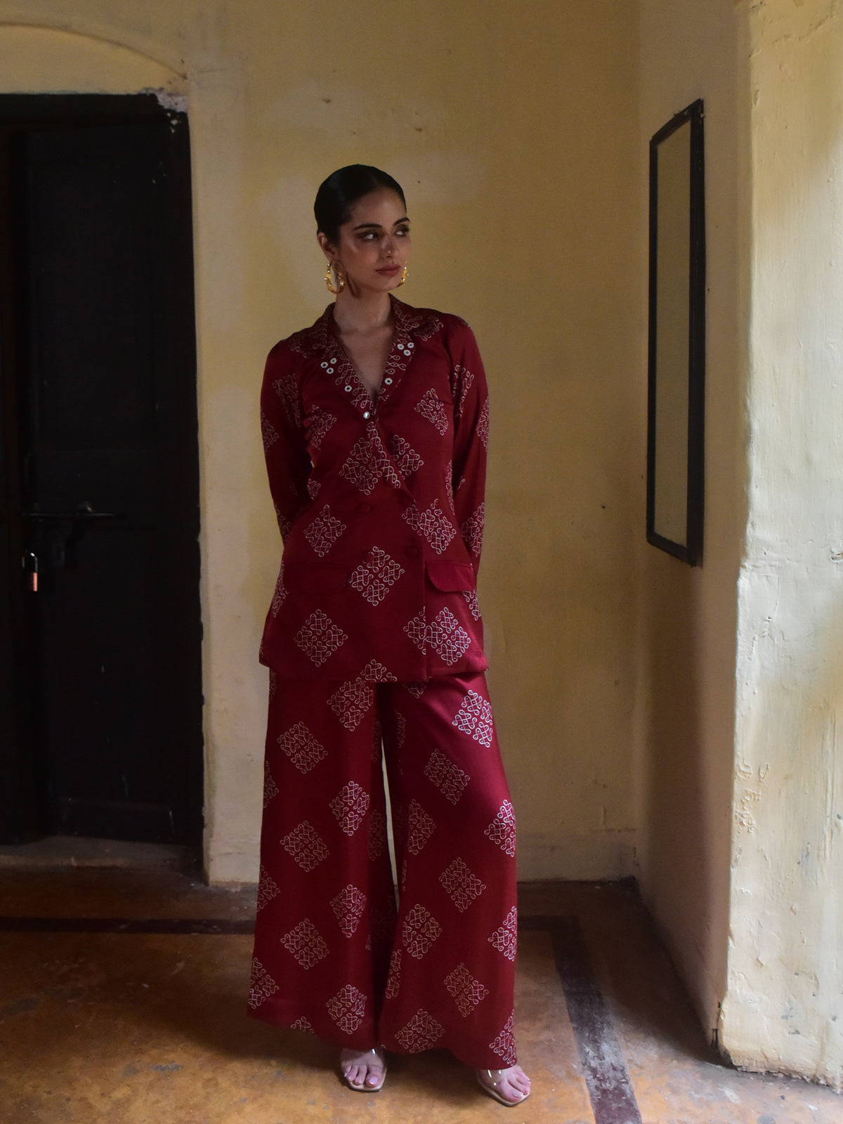 Tailored in maroon kolam printed modal satin, this embroidered double-breasted blazer is the perfect festive layering piece. With delicate hand embroidery on the lapel collars, flap pockets in the front for structure, it adds polish to any celebratory outfit. Pair it with the matching flared pants or throw it over a slip dress for events like festive galas, cocktail nights, or modern wedding festivities. Accessorise with a layered necklace and an elegant clutch for a festive-chic ensemble.