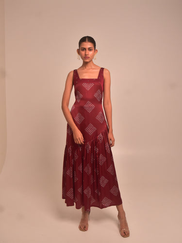 Elegantly tailored in our maroon kolam printed modal satin, this sleeveless dress features an asymmetric yoke that adds contemporary character while subtle gathers below create soft movement. Hand embroidery along the neckline and practical side pockets complete this thoughtfully designed piece. A perfect choice for day-to-night festive dressing. Elevate the look with statement earrings and minimal heels.