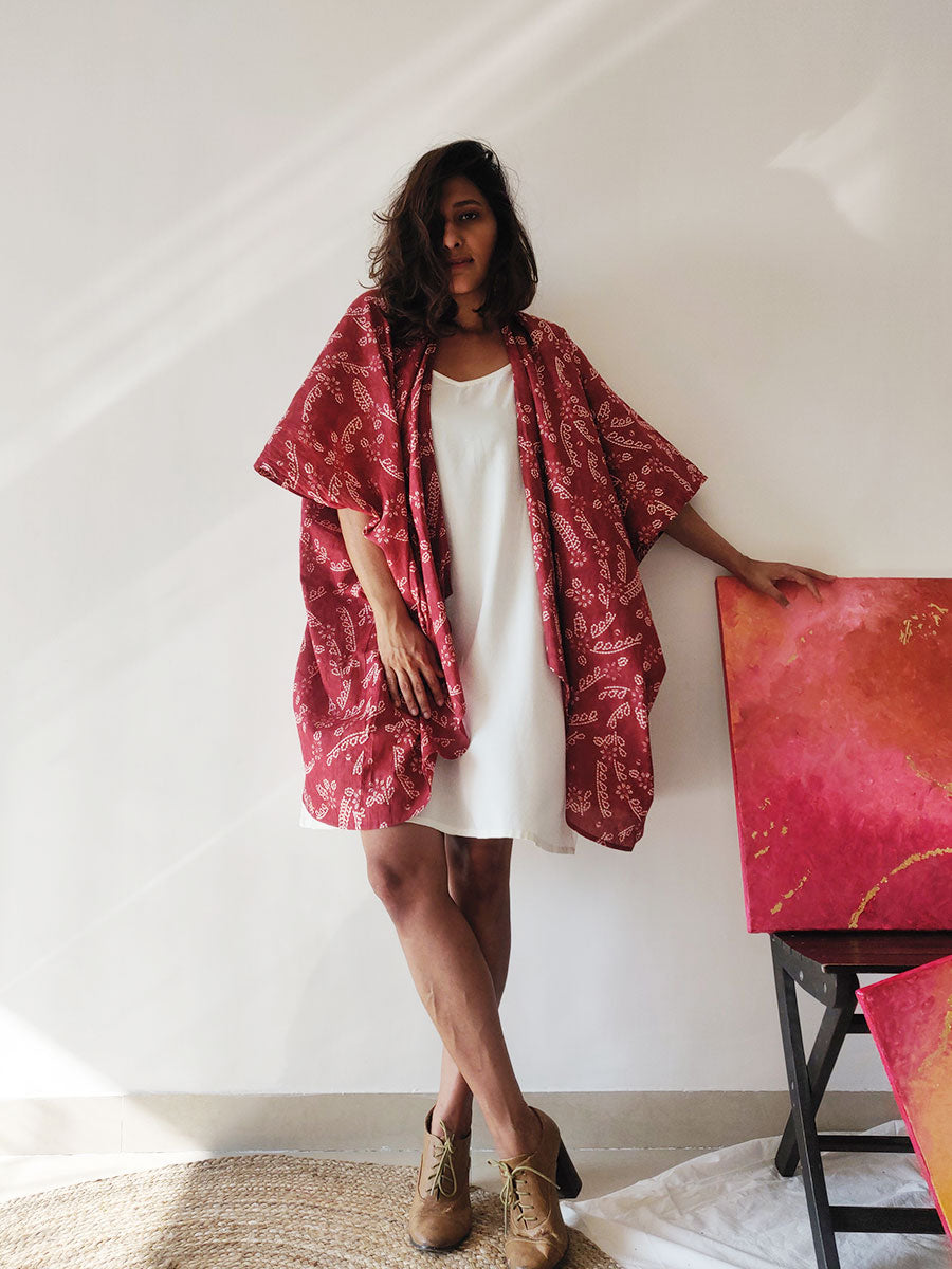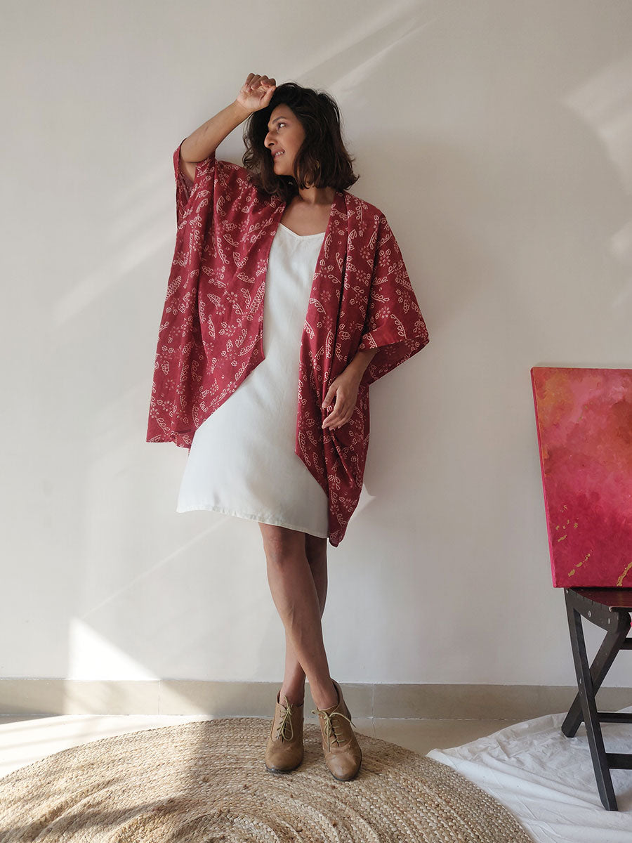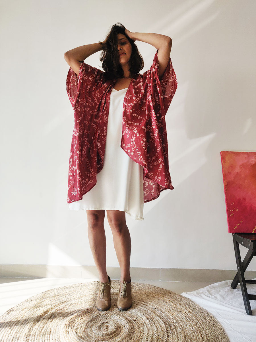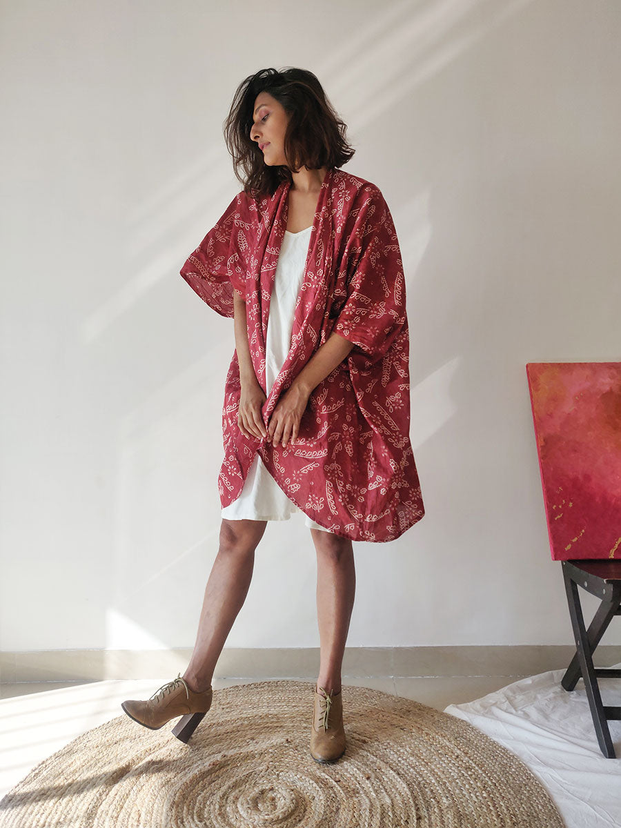 This gorgeous maroon cotton kimono-jacket is a must-have! It has long sleeves and is loose and billowy, making a great layer over any outfit! Wear it to the beach over shorts or a cute dress, or as a fun throw over your bikini, and you're good to go!