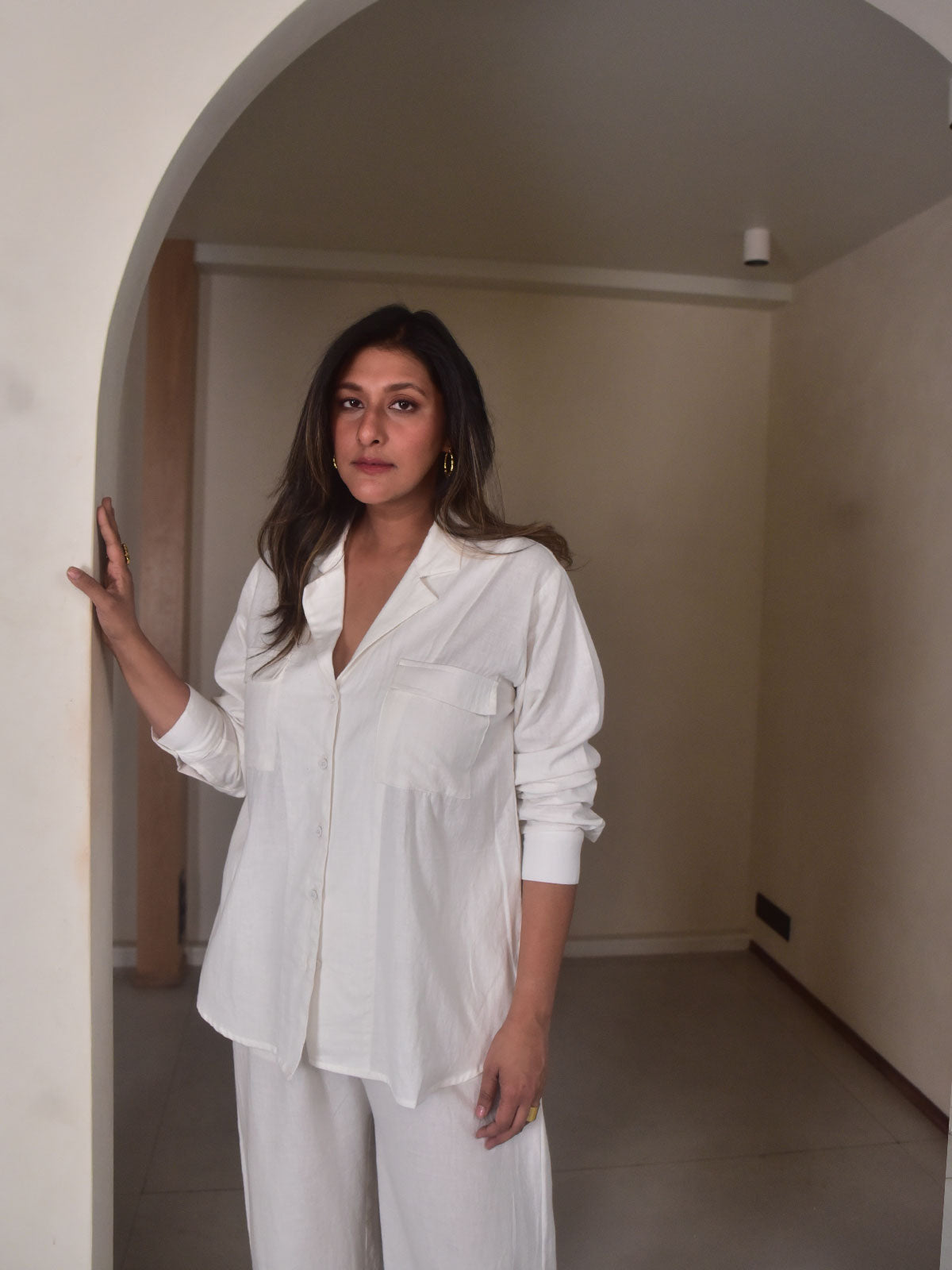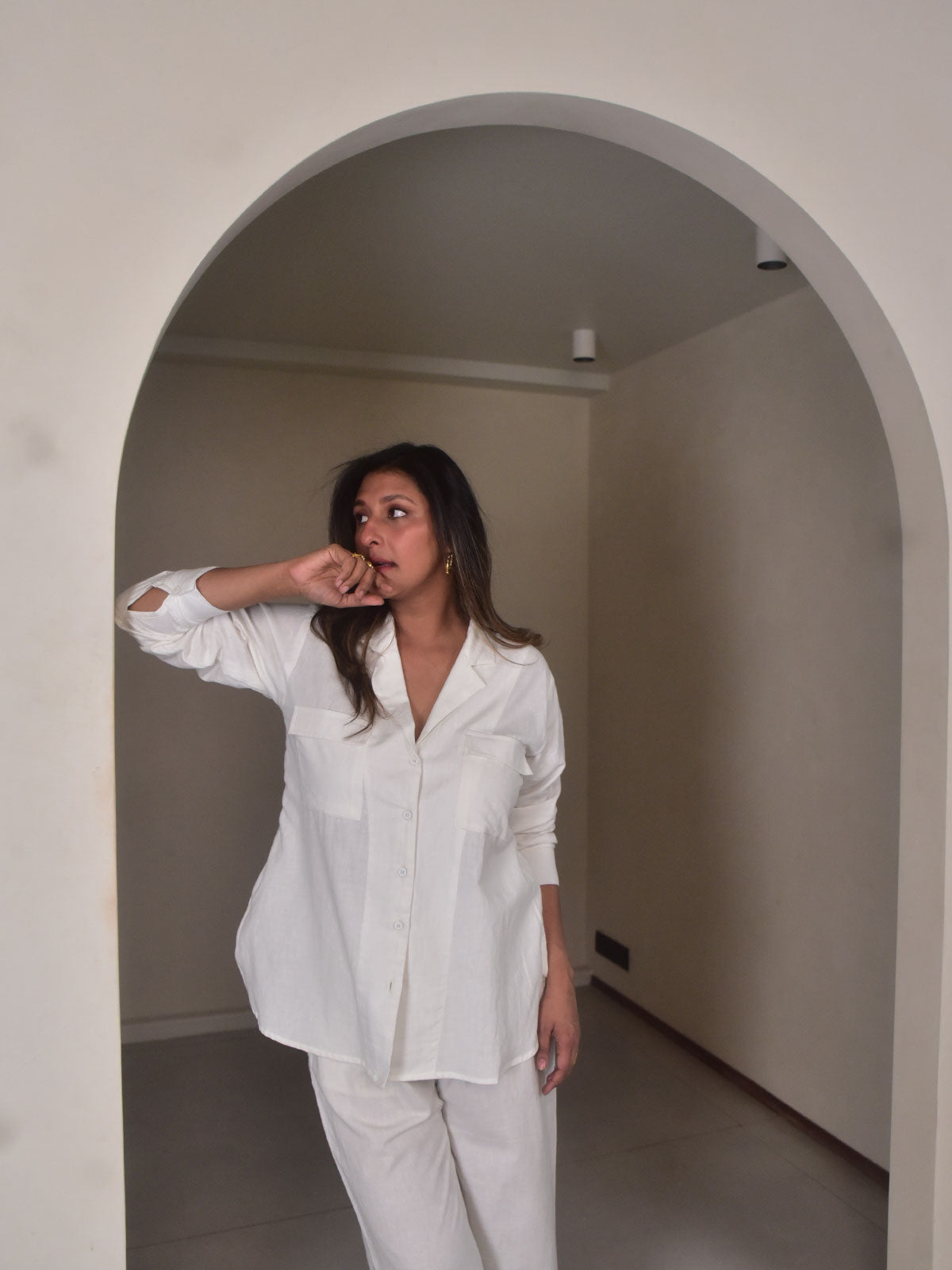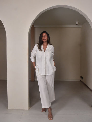 Classic and refined. Crafted from our exclusive white cotton linen, it features a lapel-style collar, full sleeves with slim cuffs, and a relaxed apple-cut hem that adds a contemporary edge. Breathable and versatile, this piece easily transitions across seasons and occasions. Style it with linen pants or denim for workdays, meetings, or elevated everyday dressing.
