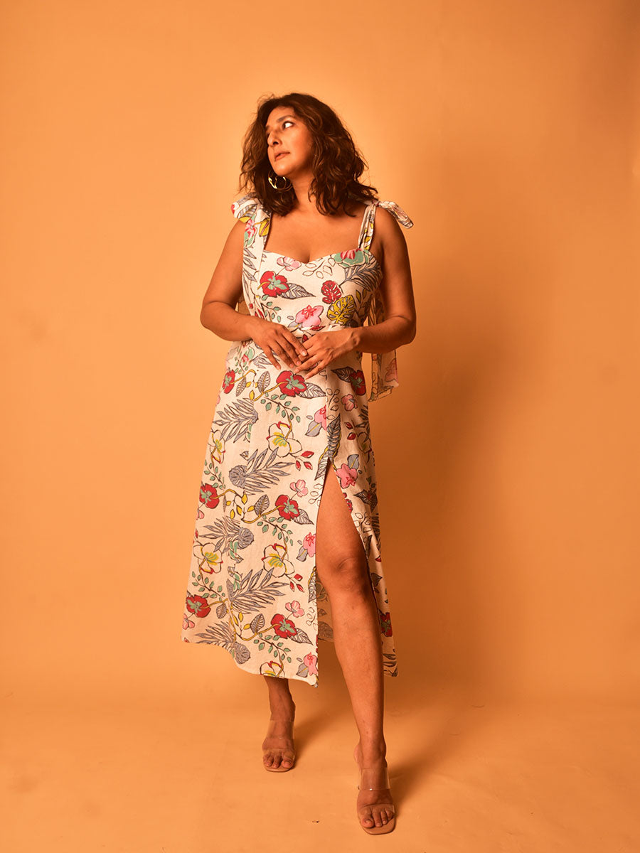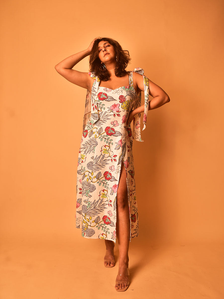 Spoil yourself with this elegant piece of magic! Cut in white and multicoloured floral printed cotton, with thick tie-up straps and a panelled skirt, the dress makes a statement with its smoking thigh-high slit. Pair with and strappy heels and you’re ready for your next getaway!