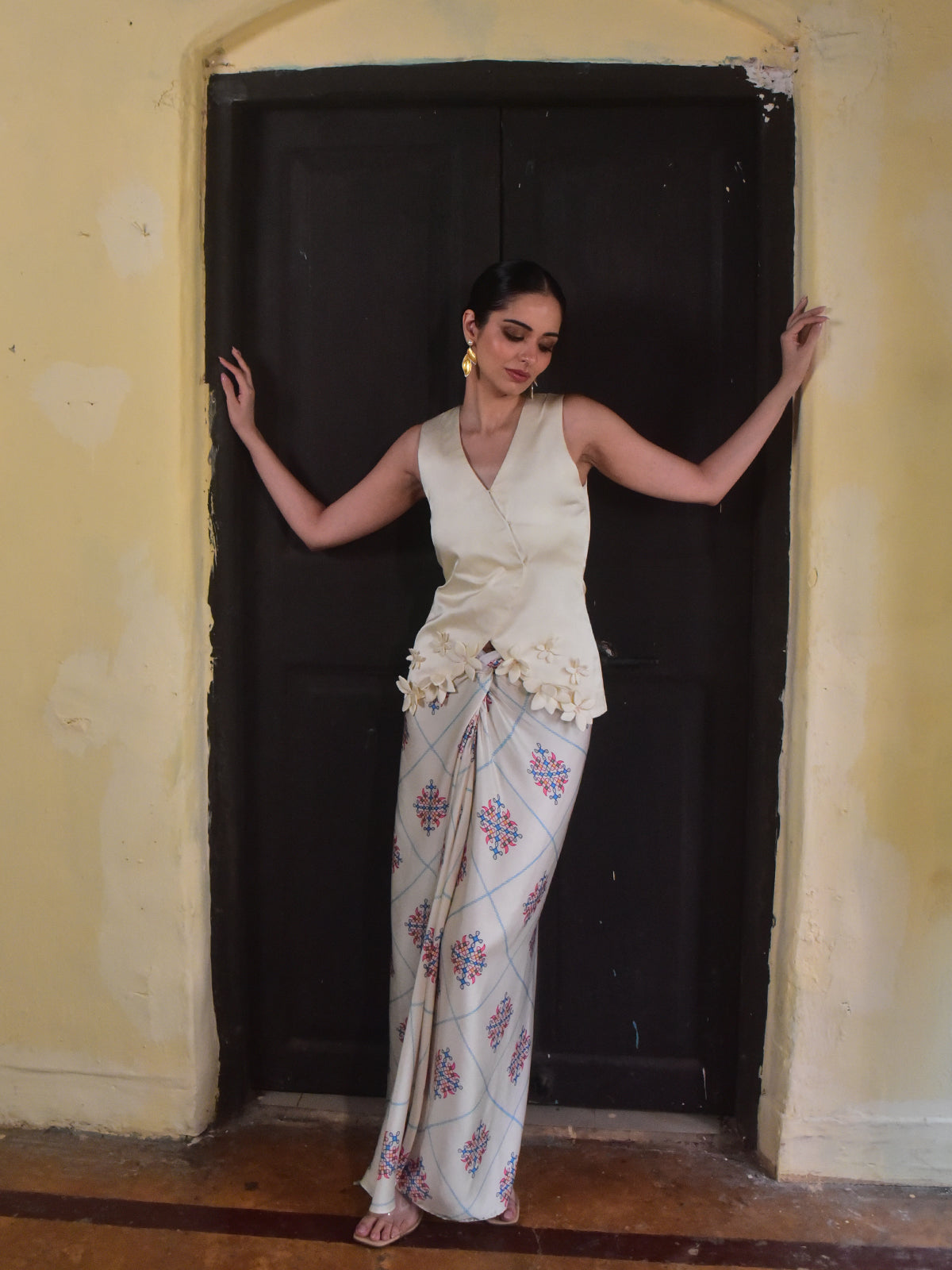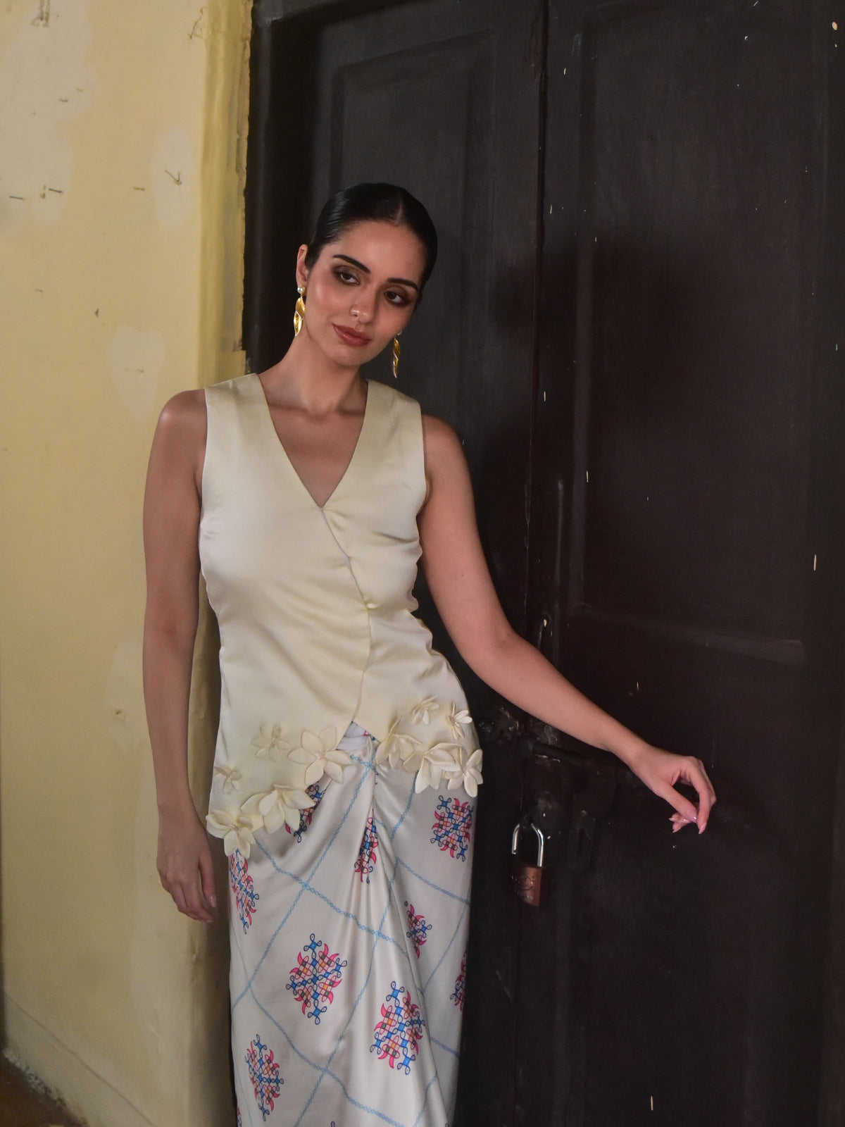 Intricately detailed with floral appliqués, this sleeveless cream modal satin vest features an asymmetric front and hook-eye closure. A perfect blend of structure and festivity, it pairs best with our draped cream kolam printed skirt. Ideal for festive luncheons or mehendi ceremonies, complete the look with layered bangles and a messy braid.