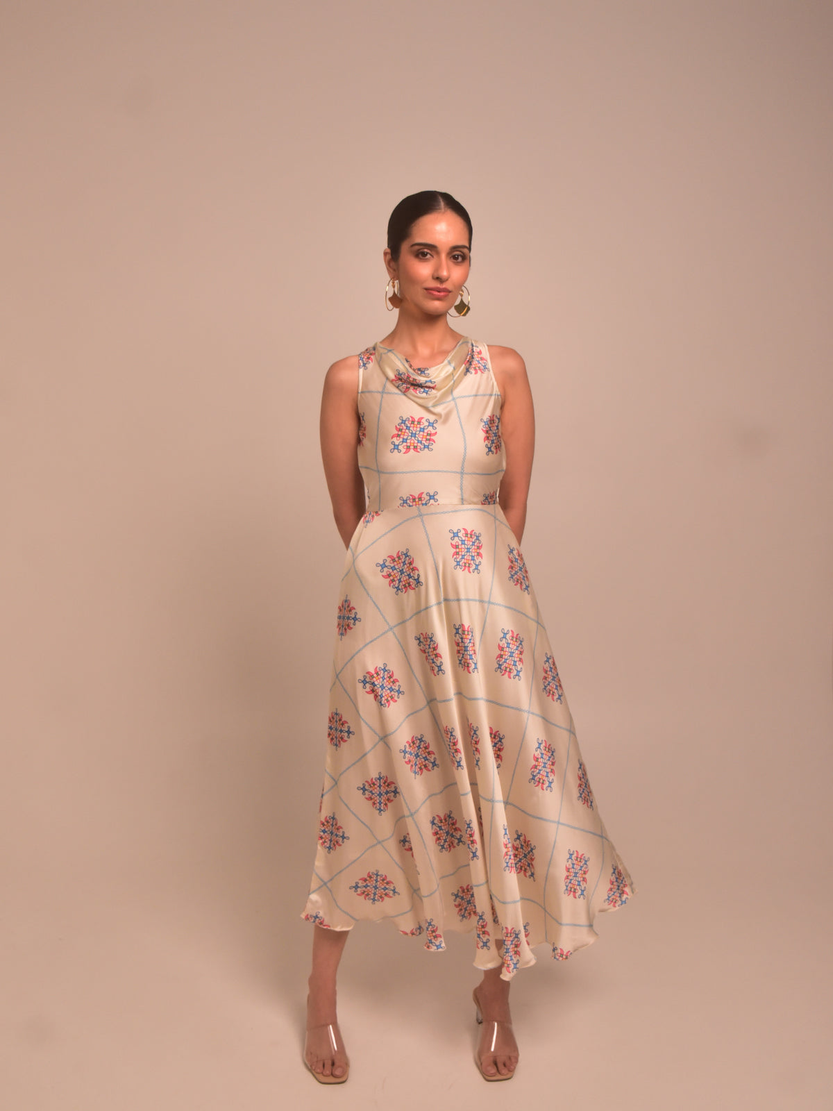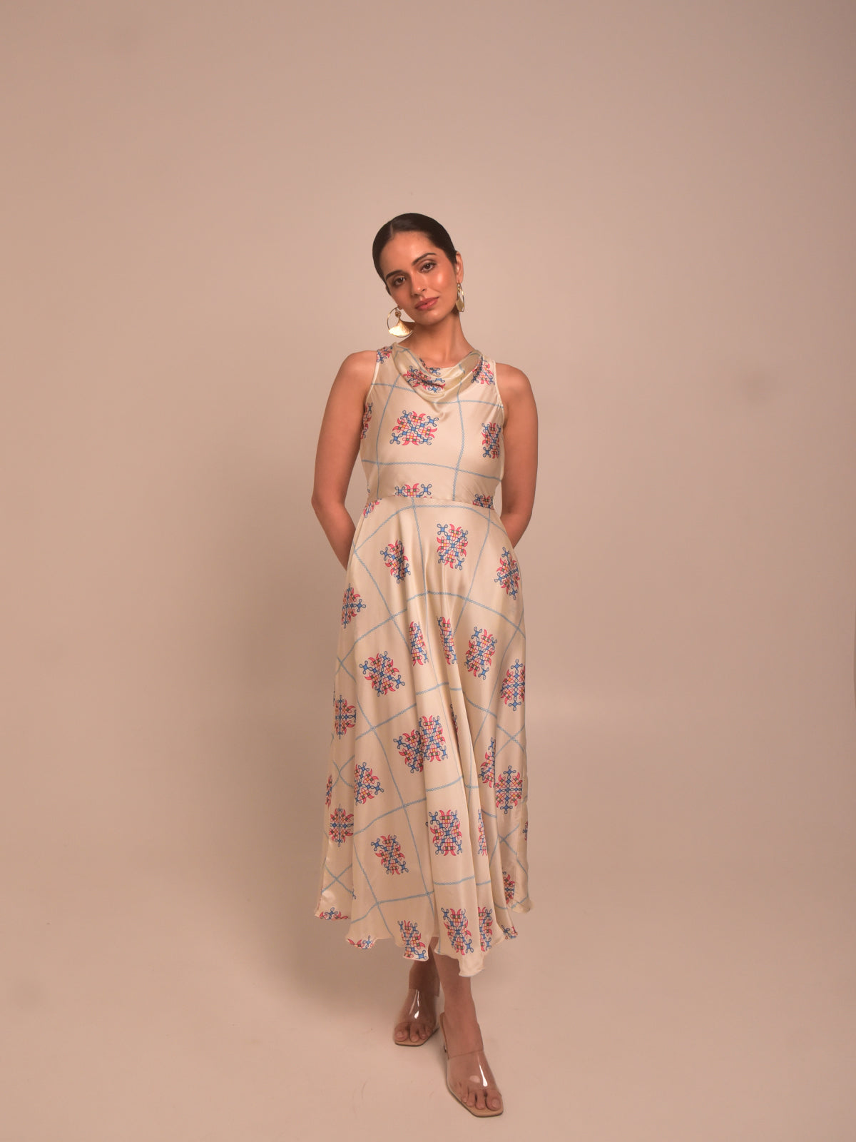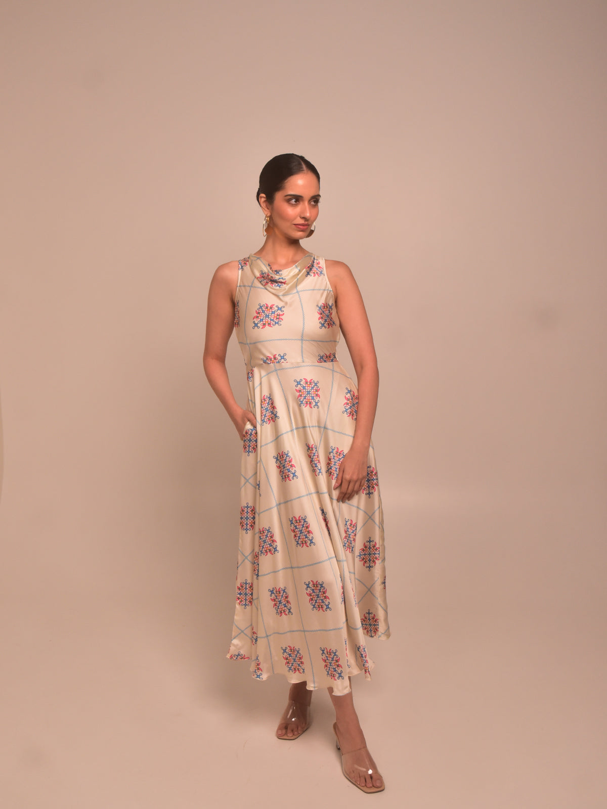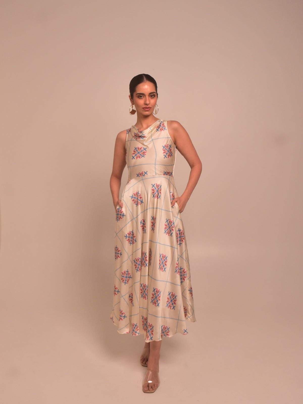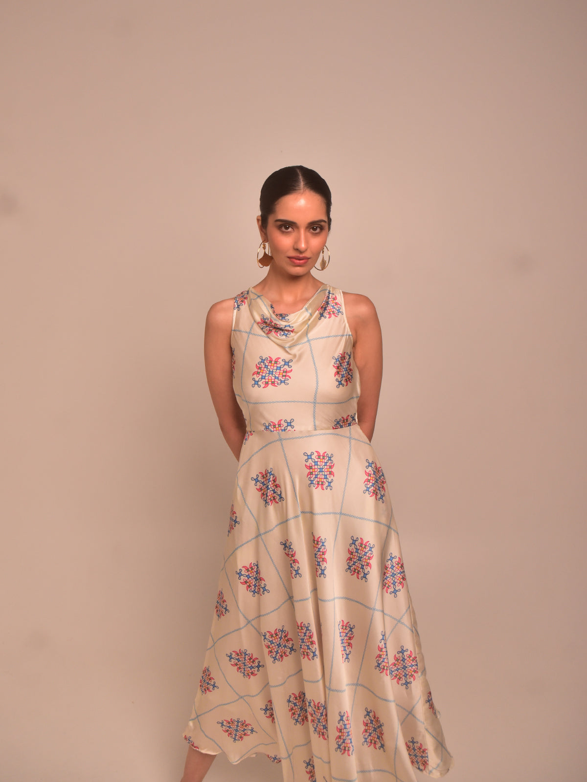 Soft and romantic, this cream kolam printed modal satin cowl dress brings graceful movement with its umbrella-cut flare. The draped neckline adds an ethereal touch while the fit-and-flare silhouette with side pockets ensures comfort. Ideal for festive brunches or intimate functions, style it with a low bun and delicate gold accessories.