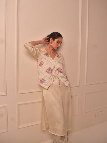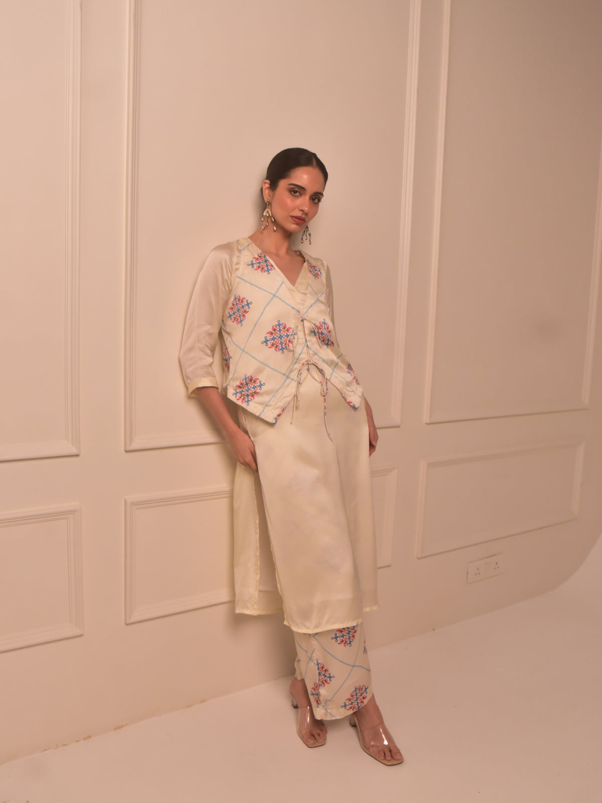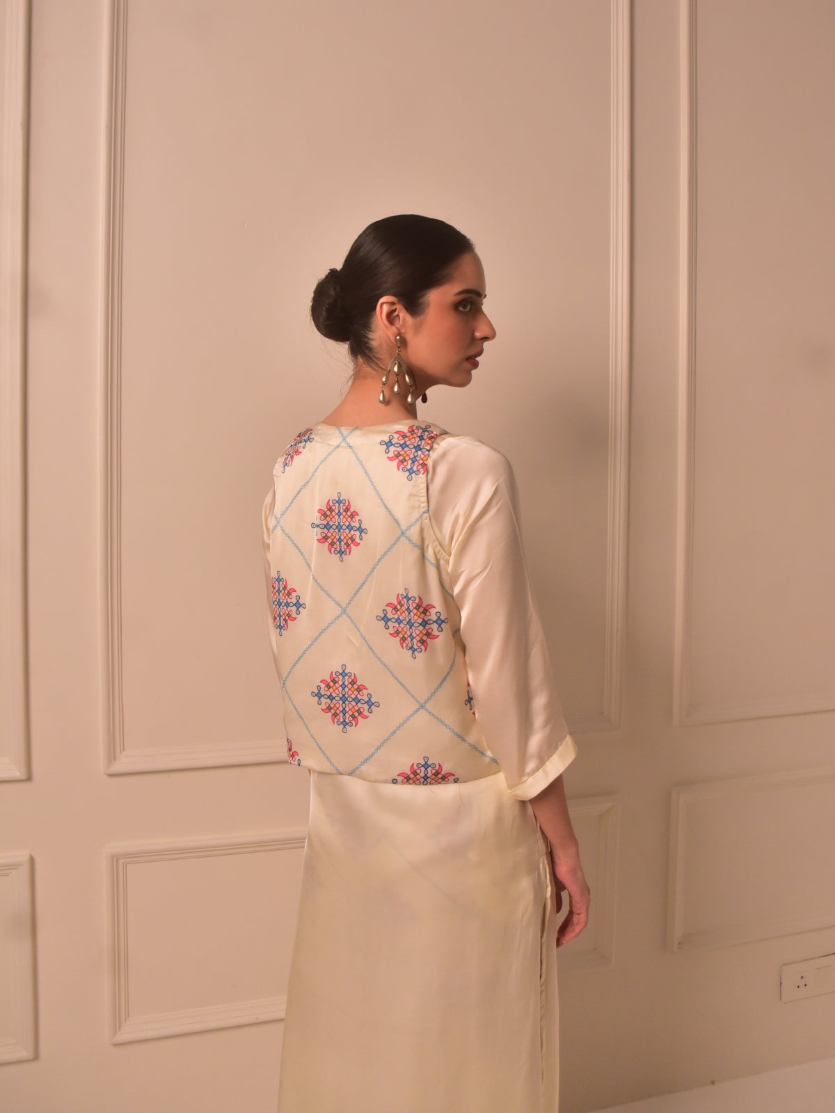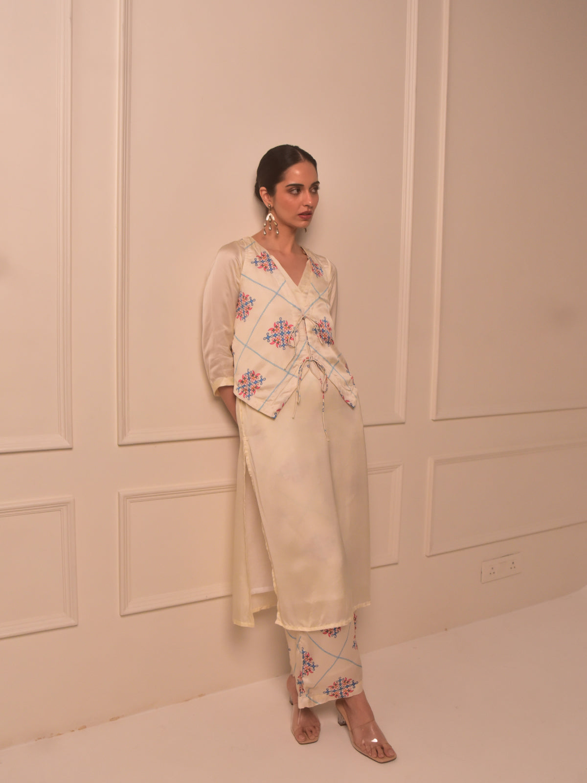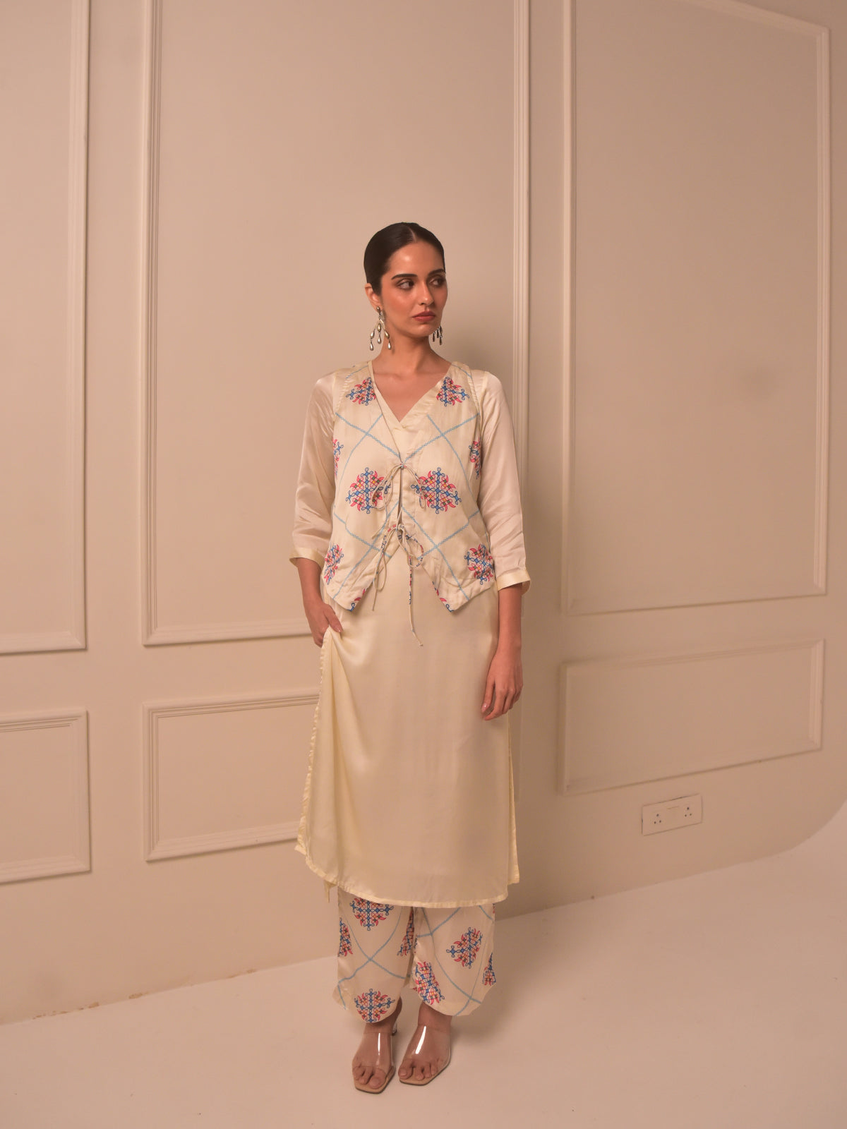 A refined blend of tradition and ease, this coordinated three-piece set includes a relaxed 3/4th sleeve kurta in cream modal satin, paired with a printed vest and high-waisted straight pants in cream kolam printed modal satin. The vest features a front tie-up and oversized fit while the pants offer a tailored yet comfortable silhouette. Perfect for festive mornings, temple visits or family gatherings, complete the look with minimal earrings and kolhapuri sandals.