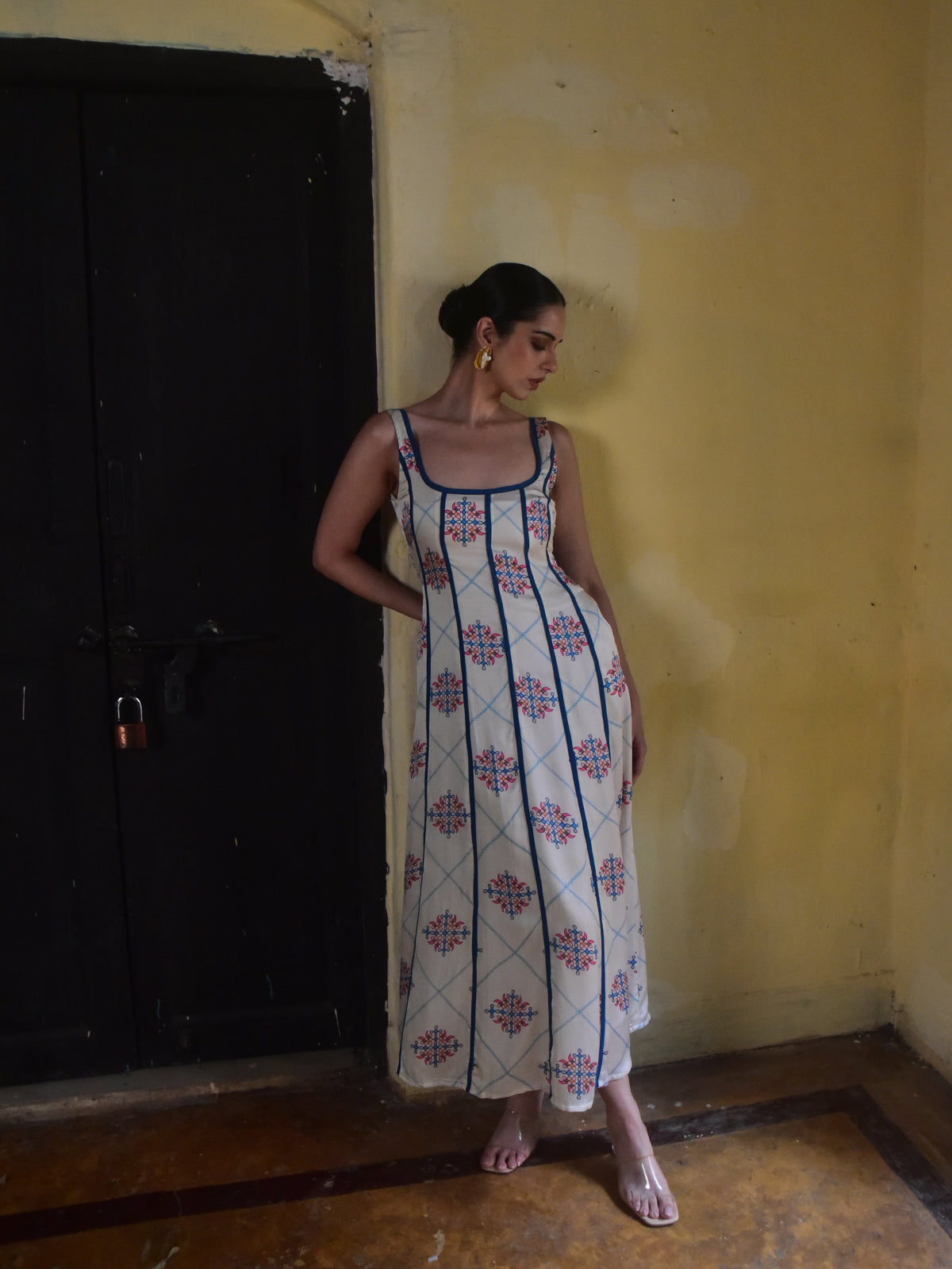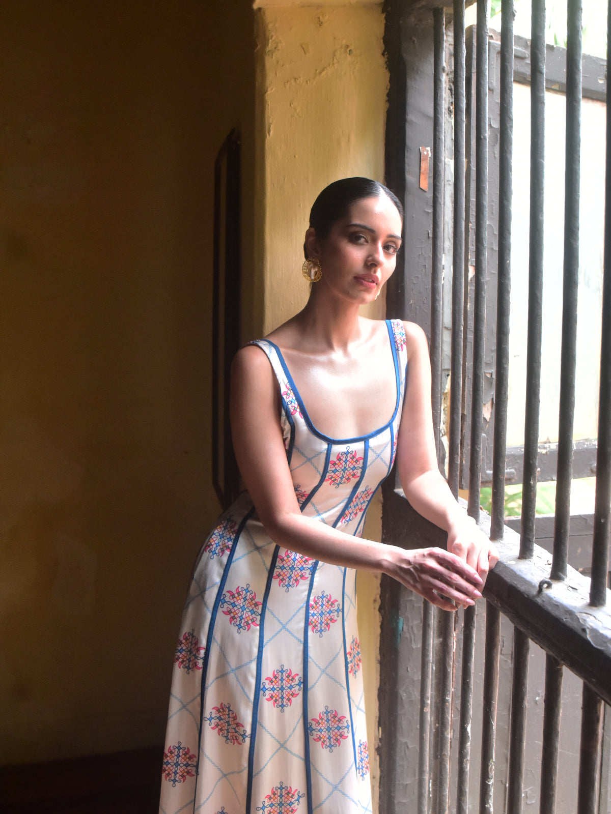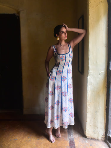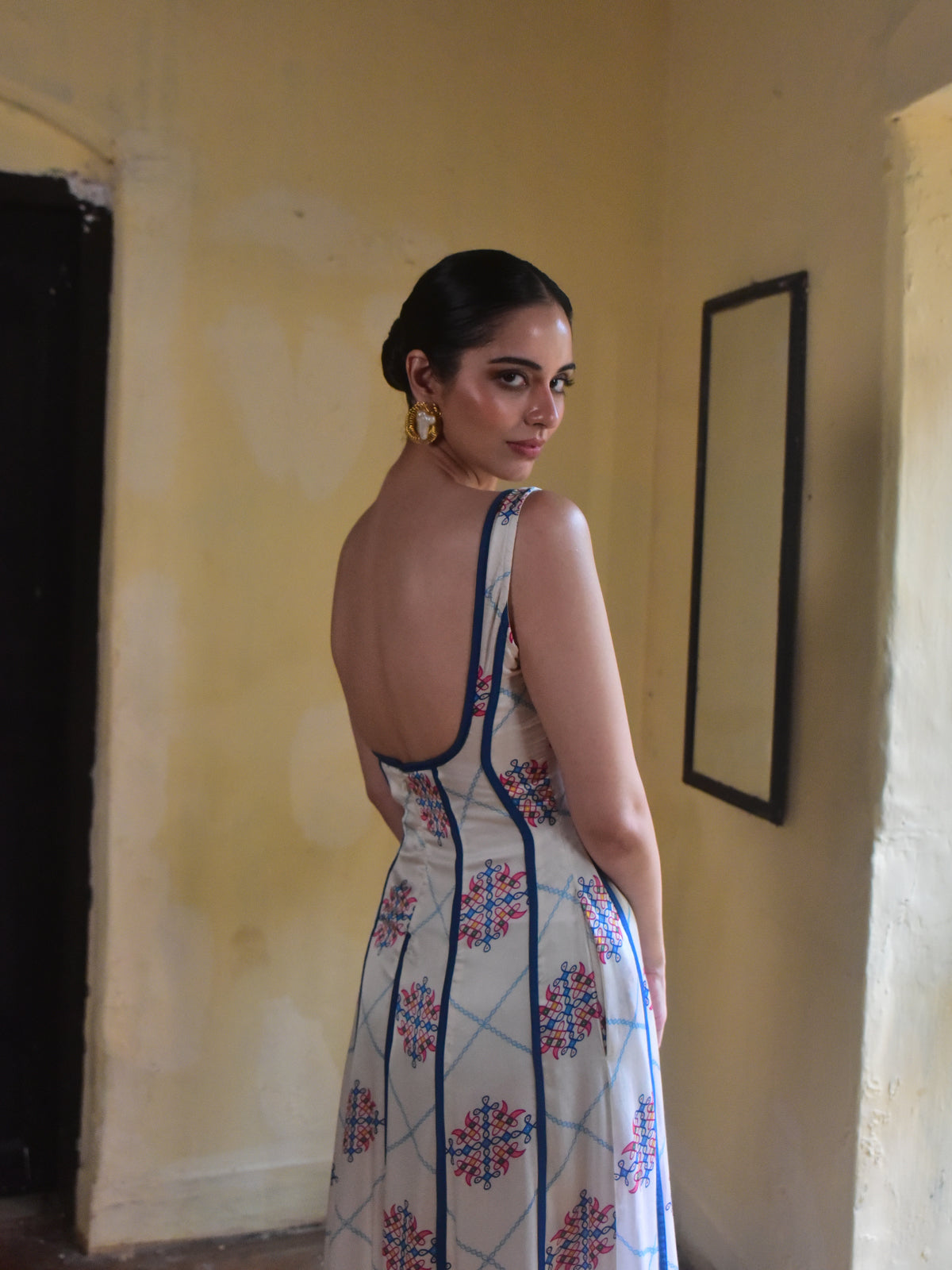 Crafted from our cream kolam printed modal satin, this panel dress features flared straight panels accented with striking cobalt blue satin borders. With its deep back, side pockets, and fitted and flared fit, it balances festive drama and refined tailoring. Ideal for receptions and evening get-togethers, style it with a sleek updo and metallic accessories.